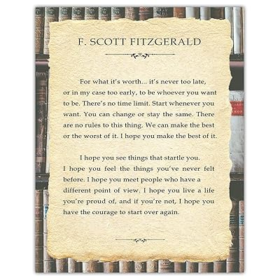 Amazon Com F Scott Fitzgerald For What It S Worth Framed Quote Gatsby Quote The Great Gatsby Quote Scott Fitzgerald Quote Gatsby Decor Great Gatsby Art Chalkboare Black Posters Prints from m.media-amazon.com Scott fitzgerald for what it's worth: All of our larger designs (a3 upwards) are printed by professionals onto a warm white, fine art paper with a matte finish, museum quality paper. It's never too late, or in my case too early, to be whoever you want to be. I hope you feel things you've never felt before. It's never too late to be whoever you want to be. Artprint 4.8 out of 5 stars 116 ratings Amazon com f scott fitzgerald for what it s worth 11x14 unframed typography book page print great inspirational gift for wedding anniversary and birthday and decor. Nehmen sie sich zeit für ihr lieblingsbuch.